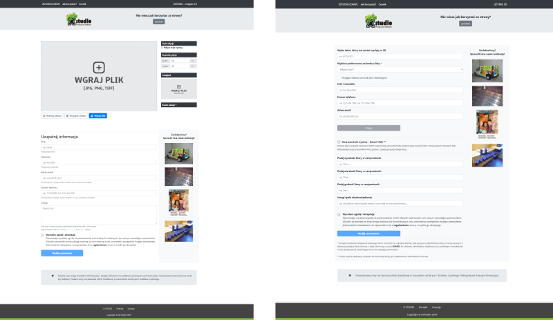 Projekt strony www, na którą klient wrzuca swój projekt graficzny, skaluje do określonego wymiaru, ustala pozycję grafiki, podaje dane zamówienia i zamawia. Zamówienie trafia na adres email wraz z opisem i screenem wykonanego przez klienta projektu.